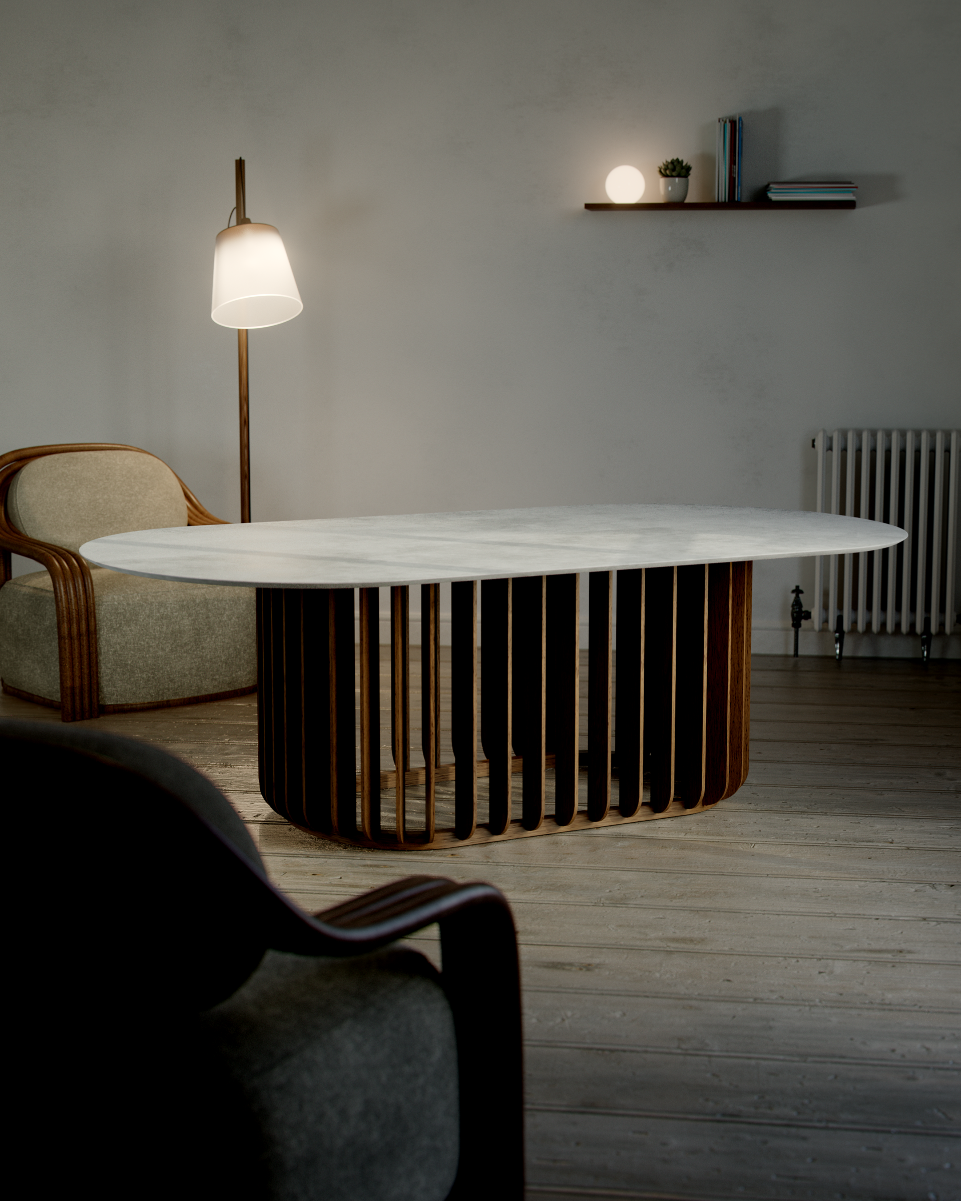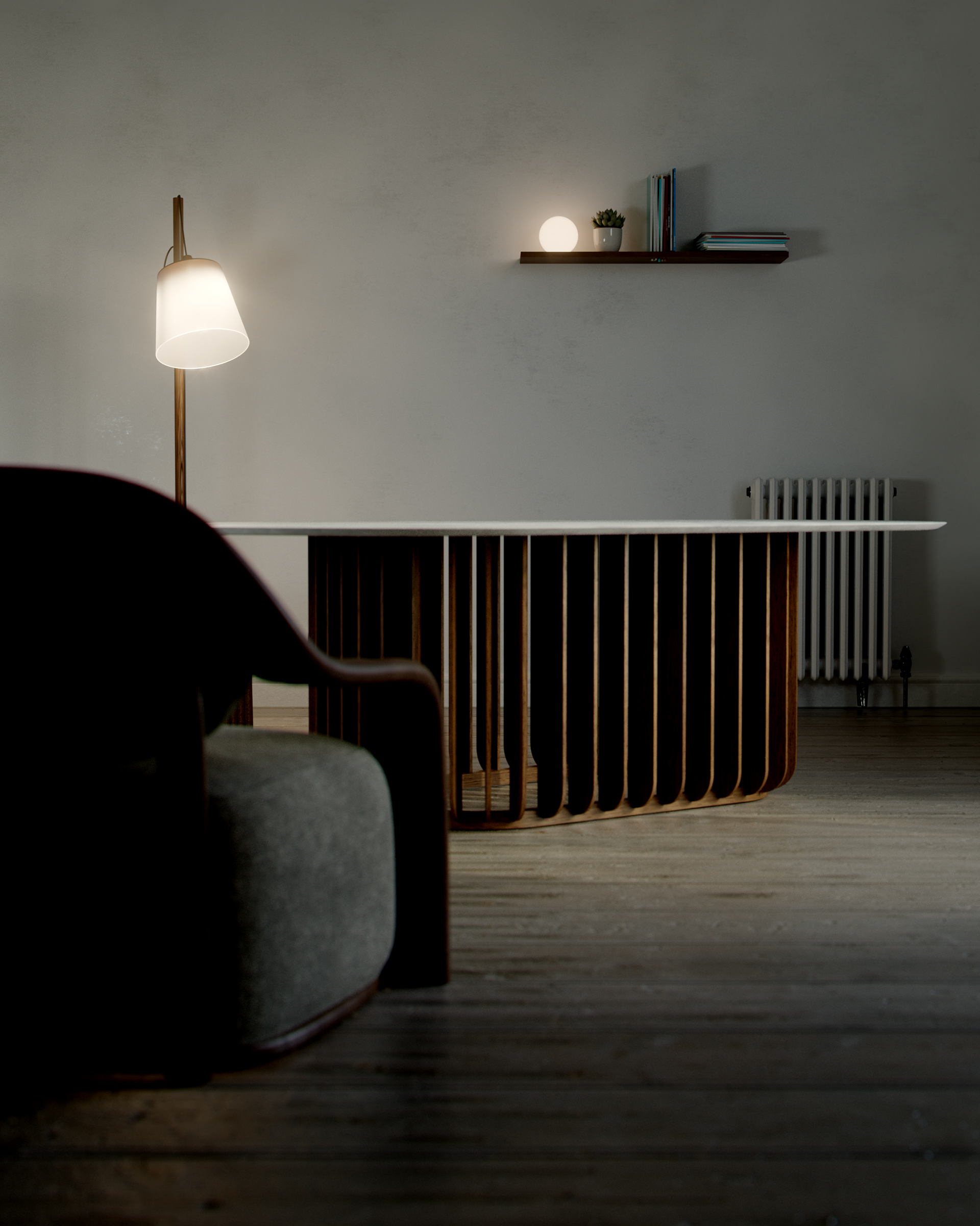Progetto di visualizzazione di interior design focalizzato sullo studio di forma, materiali e luce.