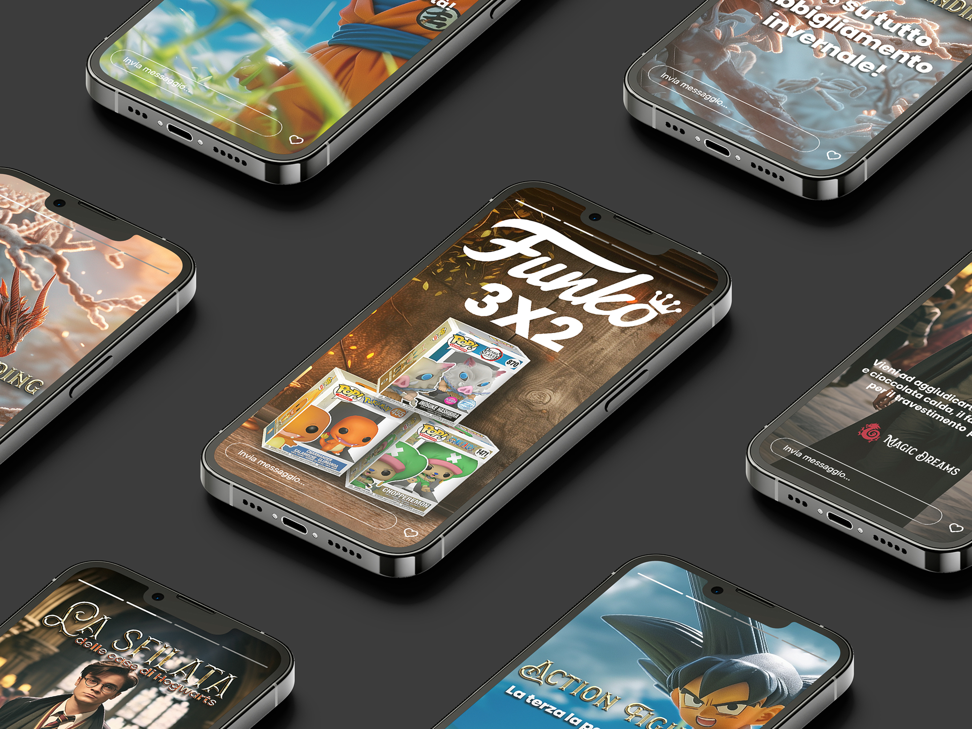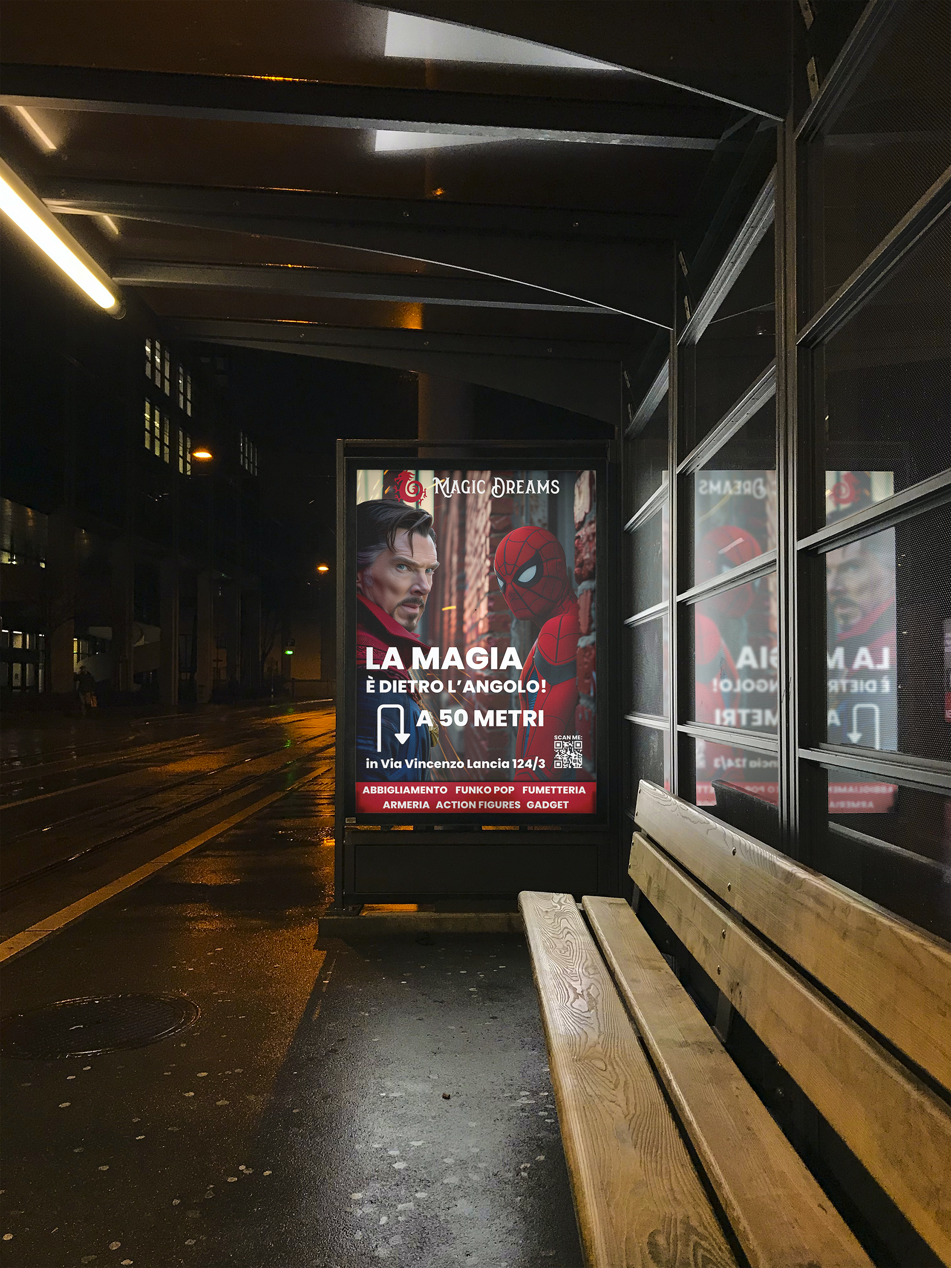 Per questo progetto ho curato la comunicazione visiva di un negozio specializzato in gadget e merchandise legati al mondo dei supereroi Marvel e DC, dei personaggi Disney e di brand iconici come Funko Pop.